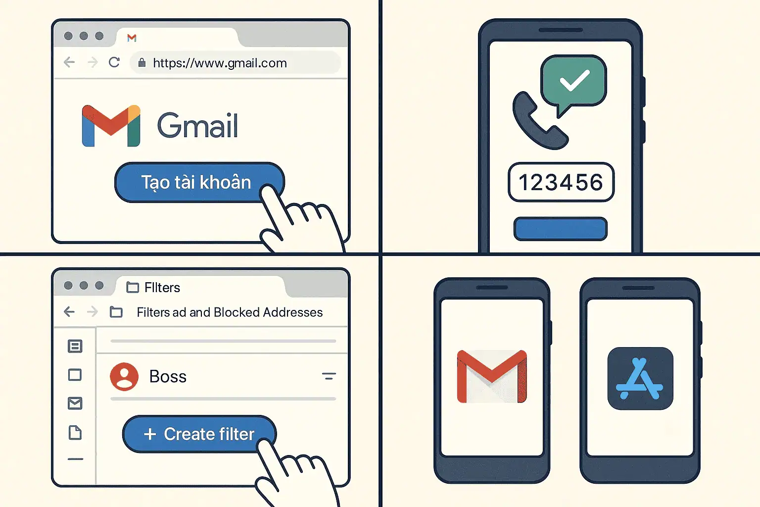- Bước 4: Tích hợp app: Tải Gmail app trên iOS/Android.